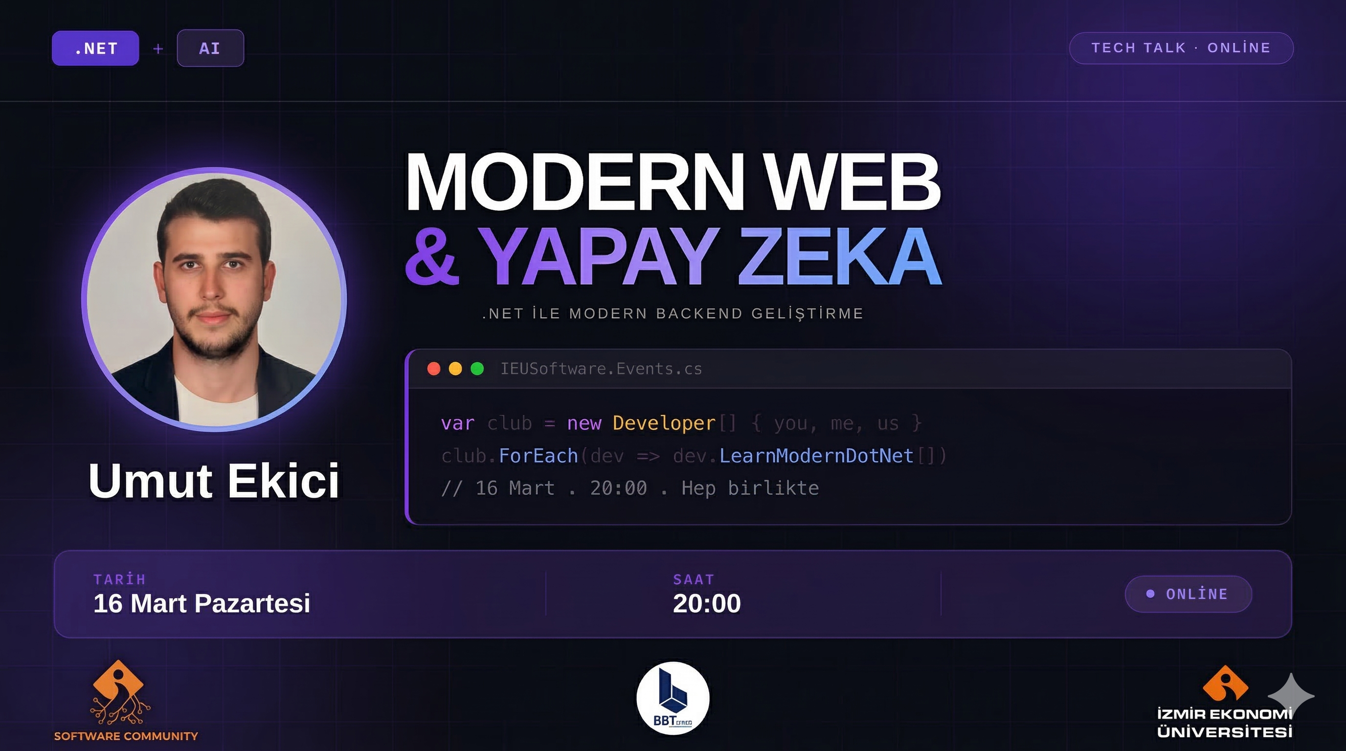 İzmir genelindeki teknoloji tutkunlarını bir araya getiren dev bir online etkinlikte buluşuyoruz! Bilgisayar Bilimleri Topluluğu (BBT) ve İzmir Ekonomi Üniversitesi (İEÜ) Software Club iş birliğiyle düzenlenen bu özel workshop'ta, modern backend mimarilerini ve yapay zeka entegrasyonlarını derinlemesine inceliyoruz. Sektörün deneyimli isimlerinden Yazılım Geliştirici Umut Ekici'yi ağırlayacağımız bu etkinlikte, kurumsal hayatta yazılım geliştirme süreçlerinden, .NET ekosisteminin modern web projelerindeki gücüne ve yapay zekanın backend mimarilerine nasıl entegre edildiğine kadar pek çok kritik konuyu konuşacağız. Hem kariyer yolculuğuna dair ilham verici tecrübeleri birinci ağızdan dinleyecek hem de .NET ile modern ve ölçeklenebilir mimarilerin nasıl inşa edildiğini sektörel bir perspektiften göreceğiz. Sektöre sağlam bir adım atmak, backend yeteneklerini geliştirmek ve teknolojinin geleceğini yakalamak isteyen herkesi bekliyoruz!